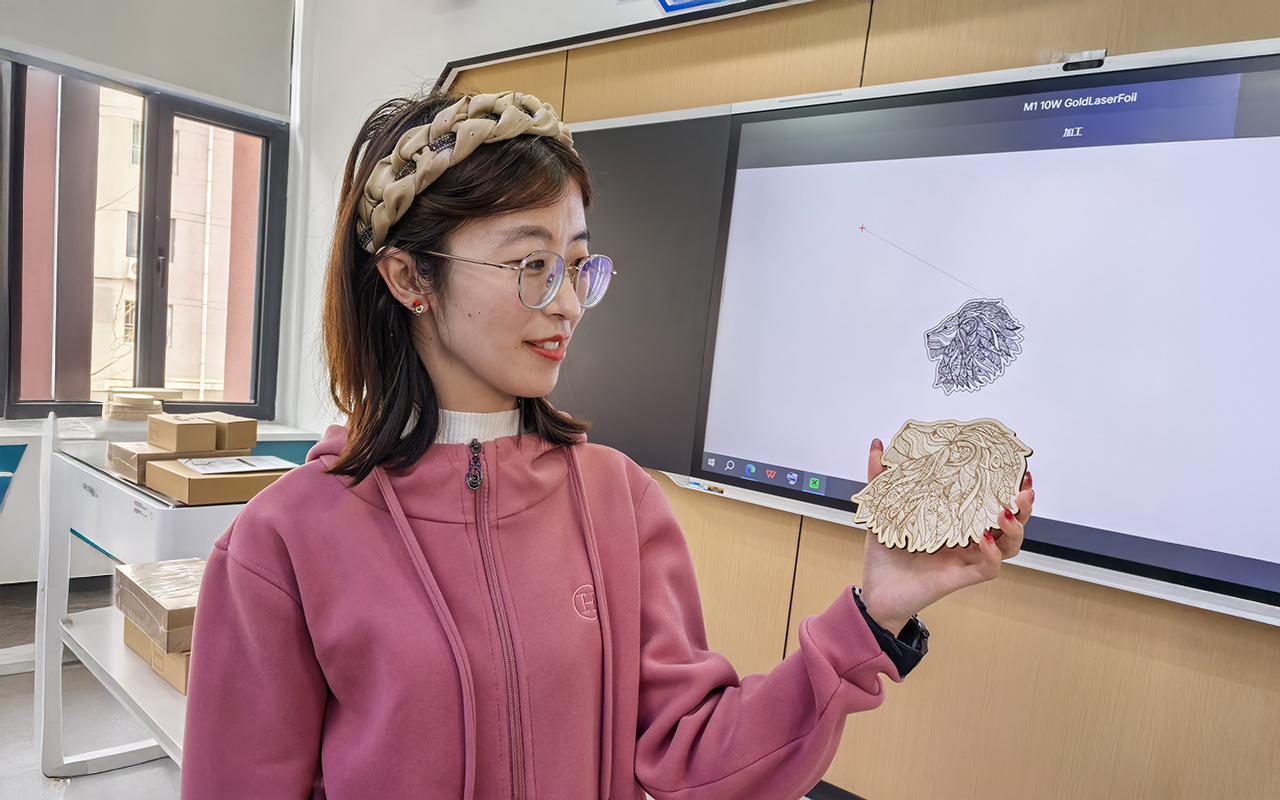 在激光雕刻体验区,青年教师们通过软件的绘图功能,看到激光束的高能量精准投射至木板表面,高效地完成图形的切割、镂空或打标工作。大家不难发现,不同的功率设置和运行速度会直接影响雕刻图形的精细程度。