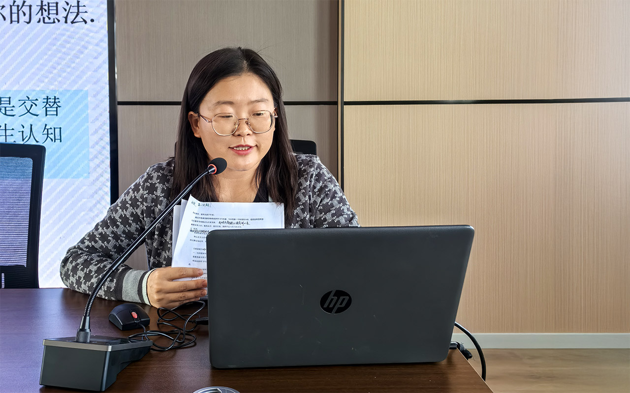 教研室副主任张捷老师基于认知冲突原理在现代诗歌教学中的应用进行了分享。她提到,课程改革要求教学从注重知识传授向关注学生思维转变。思维型课堂注重学思结合,激发学生积极思维。语文思维型课堂教学需将知识、情感、思维等有机融合。她从四个方面分享了如何将认知冲突原理应用于现代诗歌的教学中,并以课本中现代诗歌的文本为例,清晰地解释了在现代诗歌教学中运用认知冲突设计教学问题,以激发学生的学习兴趣,激活学生的思维能力。